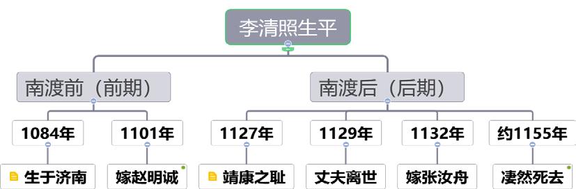 通过思维导图,梳理李清照的生平事迹及前后期阶段的代表性作品。