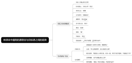王羲之的《兰亭集序》在语言表达上具有广泛的文言文特色,造成源语言和目标语言之间的差异。其中,词汇方面包括地名、时间表达、祭祀礼仪、游戏、通假字、古今异义、典故、借代、虚词和词类转换等 [2][5];句式包括省略内容的意合句和需要调整结构的中英差异句。在翻译过程中,林语堂着重处理了这些特殊的语言现象。