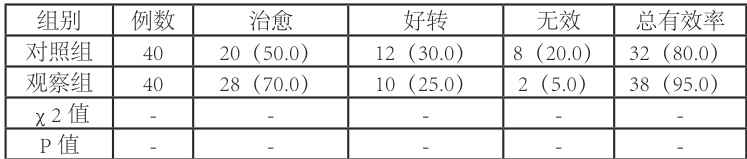 治疗后,观察组治疗总有效率为 95.0% ,高于对照组的 80.0% ,差异有统计学意义( P<0.05 )。见表 1。