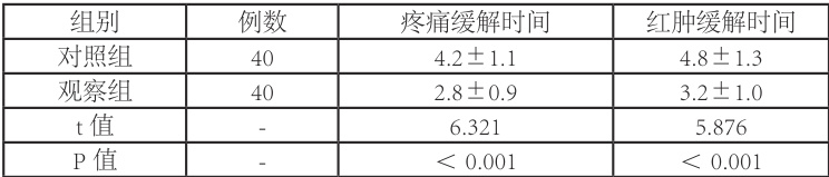 (2)症状缓解时间:记录两组患者疼痛、红肿等症状缓解的时间,以症状明显减轻或消失为标准。