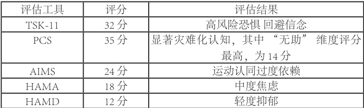 复评结果:TSK-11=26 分(中度风险), PCS=28 分(中度认知偏差),HAMA=12 分(轻度焦虑)。