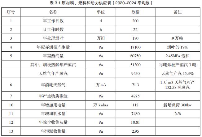 Y 公司设计生产能力为 180 万担(9 万吨)/ 年,年产废弃烟梗 1.7 万吨。原来的处置办法是一部分作为循环流化床锅炉燃料,与燃煤一起掺烧,一部分粉碎后做生物有机肥的原料。2017 年烟叶公司实施煤改气项目后,2 台燃煤锅炉改为 2 台 20t/h 燃气锅炉后,无法掺烧烟梗。目前烟梗只能委托有资质单位代工粉碎毁形,每年烟梗处置费用需花费数百万。如果能将烟梗气化后与天然气混烧,即使减少一半的天然气消耗,每年将节约燃料费。加上节约的烟梗处置费用,经济效益明显。[5]