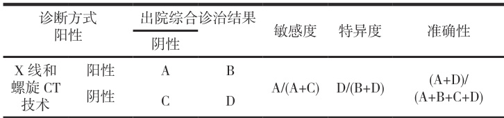 X 线和螺旋CT 技术的灵敏性、特异性和准确性,计算方式如表1。