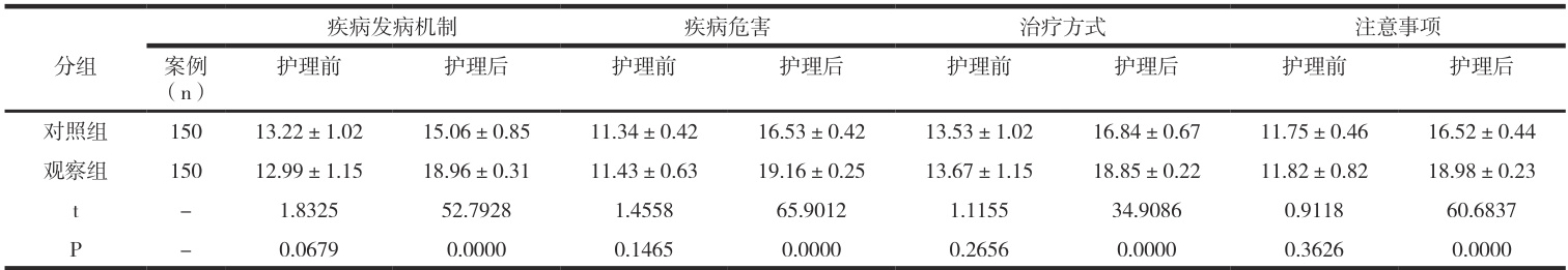 患者对于疾病发病机制、疾病危害、治疗方式、注意事项等方面认知进行评测,单项最高分设定为20 分,分值高、认知水平良好。
