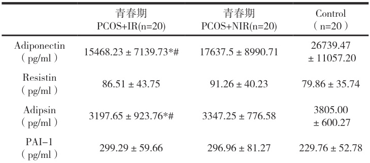 青春期 PCOS+IR 组 APN 水平最低,明显低于其他两组,三组比较差异具有统计学意义( P<0.01 );青春期 PCOS+IR 组同青春期 PCOS+NIR 组以及正常对照组比较 Adipsin,差异具有统计学意义。