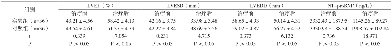 实验组治疗后 LVEF 明显高于对照组,LVESD、LVEDD、NT-proBNP 明显低于对照组( P<0.05 ),见表1。