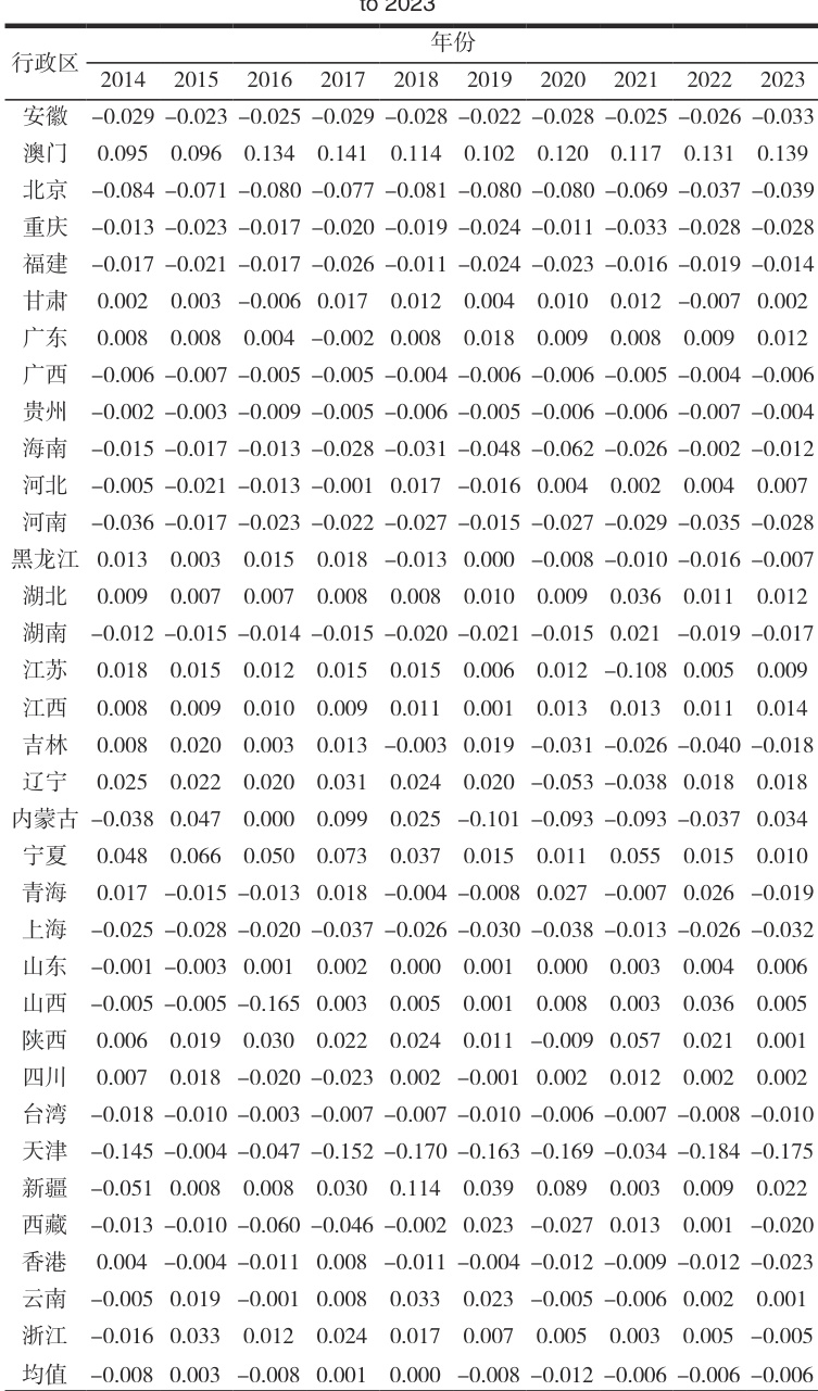 表2 2014 年至2023 年中国各省级行政区双变量莫兰指数