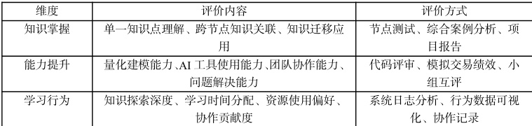 《金融工程人工智能与量化实训》是金融工程专业的实训课程,融合了金融理论、数学模型、人工智能算法及量化投资实践,旨在培养学生运用数智化工具解决复杂金融问题的能力。然而,传统课程评价以考试为主,存在以下局限:一是侧重知识点记忆,忽视知识关联与实践应用;二是缺乏对学习过程的动态监测,难以及时调整教学策略;三是未充分考虑学生个体差异,难以满足个性化发展需求。随着知识图谱技术的成熟,将其应用于课程评价,可为破解上述问题提供解决方案。
