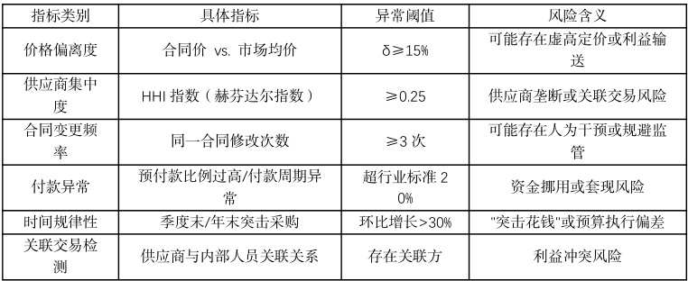 基于三维数据构建 PAI,通过加权评分量化风险。核心指标含价格偏离度(权重 0.3,阈值≥15%)、供应商集中度(权重 0.2,HHI≥0.25)等 6 项,按 PAI 值分三级预警:低风险( <3 分)季度汇总、中风险(3-7 分)专员核查、高风险(≥7 分)冻结流程。某集团 2023 年触发高风险预警 8 次,挽回损失 380 万元,响应时间从 72 小时缩至 4 小时。