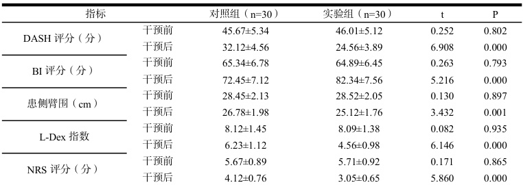 表 1 对比 DASH 评分、BI 评分、臂围、L-Dex 指数、NRS 评分( x s )
