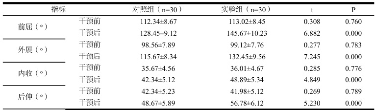 干预后,实验组肩关节活动度更高,P<0.05。(如表 2 示)。