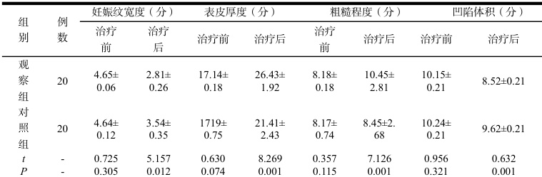 观察组增加二氧化碳激光,采用YAG 等医用激光治疗仪(上海嘉定光电仪器有限公司)。治疗前先使用皮肤超声(皮肤超声诊断系统,津食药监械(准)字2013 第 2230001 号)对妊娠纹进行测定,以评估治疗效果。患者妊娠纹凹陷深度较大,以1-2W 实施磨削模式对妊娠纹边缘实施磨削。再实施点阵DeepFx 模式,其详细参数如下:光斑 5 mm,能量密度范围 100~140 mJ/cm2,点间距 1.2~1.5mm ,对患者妊娠纹实施治疗,每月1 次,连续治疗3 个月。