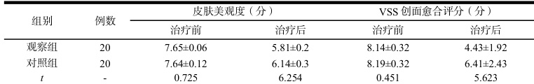 治疗前,两组患者的观察指标对比差异不具有统计学意义 P>0.05 ),治疗后,观察组患者皮肤美观度优于对照组,VSS 创面愈合评分优于对照组,差异对比有统计学意义 P<0.05⋅ ),见表2: