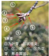 2.4.1、认识樱花花芽与叶芽:分化完成后的樱花花芽与叶芽在形态上有明显的区别,通常花芽饱满圆润,有的窄椭圆形如重瓣寒绯樱,有的卵圆形如初美人樱,而叶芽相对于花芽来说长得细尖形状,芽尖尖锐。观察发现,樱花的花芽有单生,也有花芽与叶芽并生,有的二芽并生中一个花芽一个叶芽或者二个都是花芽;有的三芽并生中二个花芽一个叶芽或者三个芽都是花芽;有的品种的侧芽里花芽多叶芽很少,几乎只在顶芽有叶芽;樱花枝条上的顶芽有可能为单生叶芽,也有可能花芽叶芽并生。顶芽为三芽并生时叶芽常居中,两侧为花芽。有时候顶芽看不到叶芽往往是因为外部原因导致叶芽受损缺失。
