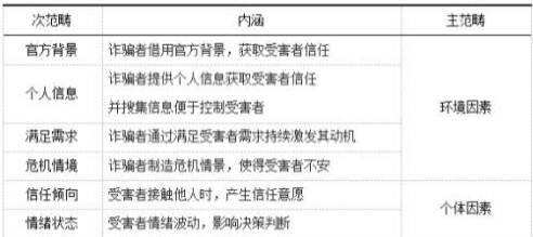 在编码归类的基础上,从环境与个体两个维度对大学生遭遇电信网络诈骗的影响因素展开分析。研究发现,包含官方背景、个人信息、满足需求与危机情境在内的环境因素与涵盖信任倾向、情绪状态的个体因素在电信网络诈骗中发挥重要作用,具体结果见表3-2。