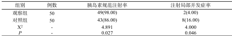 2.1 胰岛素规范注射率、注射局部并发症率相比,观察组胰岛素规范注射率更高,注射局部并发症率更低( P(0.05) 如表