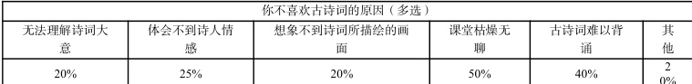 根据表 5、表 6 可得,在古诗词教学的课堂中,学生不喜欢古诗词最大的一个原因就是因为课堂过于枯燥无聊,没有激起学生的兴趣。不喜欢学古诗词的人认为学古诗最难的是背诵默写古诗,占50%,理解诗词大意和赏析古诗,想象诗词所描绘的画面是绝大学生学习的难点,都占 40%。