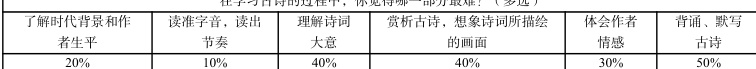 在前面的调查中很多学生不喜欢古诗词课的原因是课堂过于枯燥无聊,那么学生究竟更喜欢哪种教学方法呢?由上图数据得知,70%的学生更喜欢通过观看与古诗词相关的图片或视频来学习古诗词,近半数的学生喜欢通过各种实践活动和多样的朗诵方式来学习古诗词,看来第三学段的学生更喜欢参与性强的、直观的、贴近生活的教学方法,这些教学方法提高了学生的学习兴趣,从主观上降低了学生的学习难度,所以学生喜欢。但是抓住关键词、手法赏析古诗词和多首古诗对比阅读学生喜爱度不高,这也说明了古诗词学习有难度。
