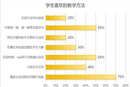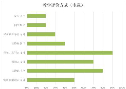 从上图得知,日常的教学评价方式基本分为背诵默写古诗词、古诗词填空、朗读古诗词、赏析和解读古诗词、古诗词创作、讨论和分享古诗词、同学互评、家长评价几个方式,其中使用最多的是背诵默写古诗词和古诗词填空,高达 90%和 80%,有 70%的学生反馈教师也通过朗诵古诗来考察学生的朗诵技巧和表达能力,有 50%的学生反馈教师通过深入赏析和解读古诗词来进行教学评价,考察教学效果。除了教师评价之外,还采用同学互评和家长评价的方式来检验学习效果,但家长评价使用较少。
