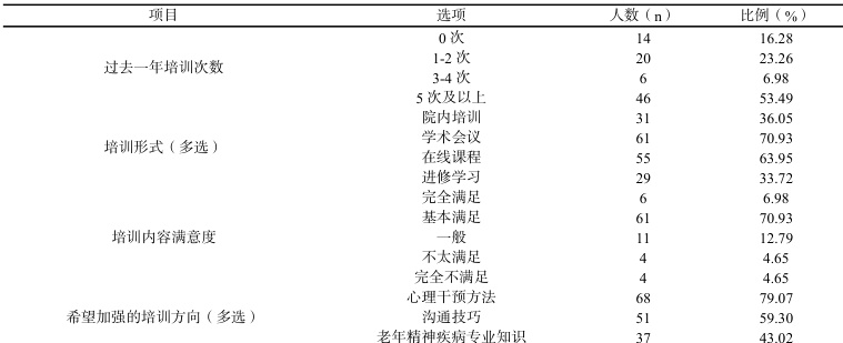 本研究对 86 名老年精神科医护人员的培训情况进行了调查,结果如表 1 所示。