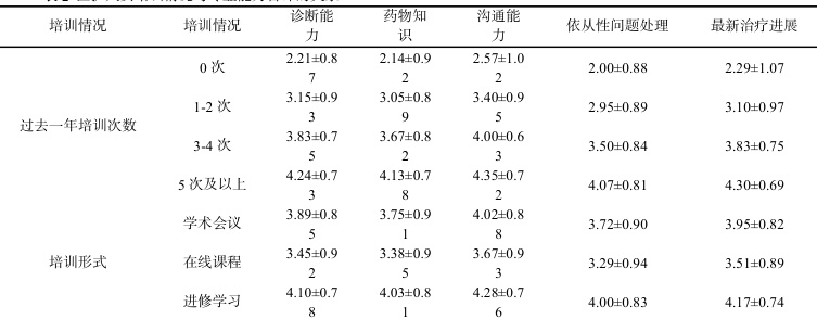 由表2 可见,培训次数与专业能力呈显著正相关。过去一年接受 5 次及以上培训的医护人员在诊断能力(4.24±0.73)、药物知识(4.13±0.78)及沟通能力(4.35±0.72)方面的得分显著高于未接受培训者(P<0.001)。培训形式中,进修学习对专业能力的提升效果最为显著(P=0.002),尤其在沟通能力(4.28±0.76)和最新治疗进展了解(4.17±0.74)方面表现突出。此外,学术会议参与者的综合能力评分(3.89±0.85)高于在线课程参与者(3.45±0.92),提示面对面交流可能更有利于知识转化。