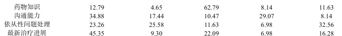 表 3 显示,医护人员在诊断能力和依 受访者认为自身诊断能力非常弱,32.56%对处理依从性问题的能力评 (52.32%),但仍有 29.07%自评较弱。药物知识方面,62.79%的 解。值得注意的是,尽管 45.35%的医护人员对最新治疗进展非常了解,但仍有 16.28 完 提示培训内容可能存在覆盖不均衡的问题。