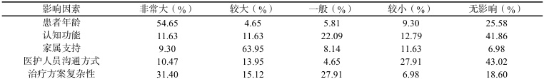 由表 4 可知,家属支持以及患者年龄是医 的依从性影响因 与之相较,对于认知功能的影响存在不同看法,有41.86%的医护人员觉得没 ,治疗方案的复杂性同样被31.40%的医护人员视作关键障碍,有 43.02%的受访者认为沟通方式对依从性没有影响,这或许和样本中沟通能力自评较高存在关联,不过也说明部分医护人员低估了沟通技巧的作用。