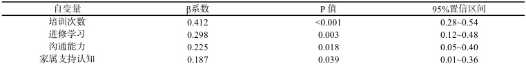 以患者依从性评分为因变量,以培训次数、培训形式、专业能力等为自变量进行多元回归分析,结果如表 6 所示。表 6 影响患者依从性的多元回归分析结果