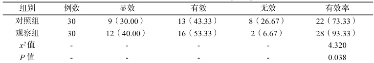 2.1 两组患儿治疗效果的比较治疗有效率,观察组高于对照组(P<0.05),如表 1。