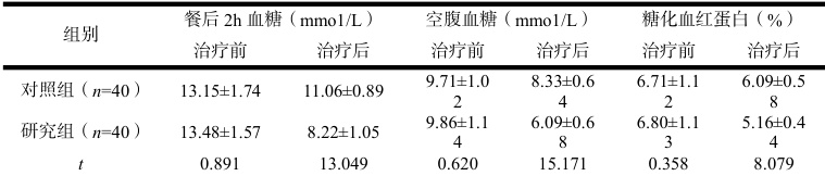 两组血糖控制效果对比 治疗前,两组空腹血糖、餐后2h 血糖及糖化血红蛋白相近( P>0.05 );治疗后,研究组空腹血糖、餐后2h 血糖及糖化血红蛋白较对照组低(