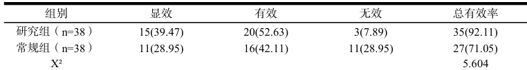 2.1 治疗总有效率比较研究组治疗总有效率显著高于常规组