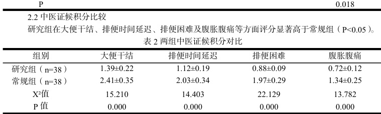 选取2024 年 4 月至 2025 年 4 月期间我院收治的 76 例肛肠病术后大便困难患者,随机分为常规组与研究组,各38 例。常规组,女患者21 例、男患者 17 例;年龄34~63 岁,平均(47.84±5.13)岁;研究组,女患者20 例、男患者18 例;年龄 32~65 岁,平均( 47.69±5.82 )岁。入组标准:(1)确诊为肛瘘、肛周脓肿、混合痔或肛裂,并已行相应手术治疗;(2)术后 48 小时内出现排便困难症状,包括大便干结、排便时间延长、排便不畅等表现;(3)术前排便功能正常,无慢性便秘史。排除标准包括:(1)术后并发严重感染或需再次手术干预者;(2)精神疾病或认知障碍影响依从性者。