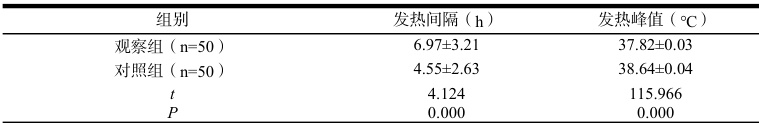 比较两组患儿的治疗效果,包括发热间隔时间与发热峰值。