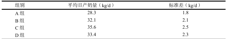 经过75 天的正式实验观察,C 组(全株玉米青贮( 70% )+苜蓿干草( 30% ))的平均日产奶量最高,达到了 35.6±2.5kg/d ,显著高于 A 组(玉米秸秆( 70% )+苜蓿干草 30% ))的 28.3±1.8kg/d( P<0.05) ),与B 组(羊草 (70% )+苜蓿干草 (30% ))的 32.1±2.1kg/d 和 D 组(全株玉米青贮 (50% )+羊草( 30% )+苜蓿干草 (20% ))的 33.4±2.3kg/d 相比也有一定优势 ⋅P<0.05 )。A 组的产奶量相对较低,具体数据见下表。