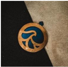 此款吊坠将黄铜片和阳极氧化钛片铆接在一起。铜片保留了部分手工打磨的痕迹,古朴大气,手工感极强。钛金属基底渐变的湛蓝色与古铜色形成强烈对比。