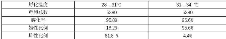 孵化温度31~34 ℃情况下,雄性比例 95.6% ,雌性比例 4.4% ;孵化温度 28~31℃情况下,雄性比例 18.2% ,雌性比例 81.8% ;温度高,雄性比例大,温度低,雌性比例大。
