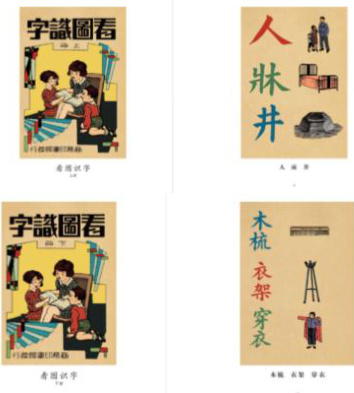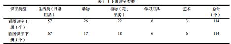这本教材分为上下册,上册主要是认识单个的生字(图 1),每个字旁边配有插图,识字的种类有:生活类(日常用品)、自然类(动植物)、学习用具和艺术这五类;下册识字的内容主要是以词语为主(图 1),同样配有形象生动、色彩丰富的插图,识字的类型跟上册的一致,且主要也是以生活类和自然类为主。