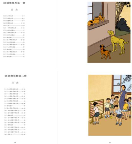 这本教材也是分为上下两册,第一册的主要内容是关于大小、长短、轻重、厚薄、数字1-10 的认识,整本教材还是以幼儿的角度为出发点,选取的内容也是幼儿生活中所熟悉的。例如,在《大小》这节内容中,选的动物是儿童熟悉的狗、猫、老鼠。第二册的内容是对第一册所认识的 1-10 的数字进行的巩固,只不过更有逻辑性,先是认识各个数字,接着是练习,主要是学习书写数字和做相应的练习题,最后是应用。