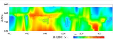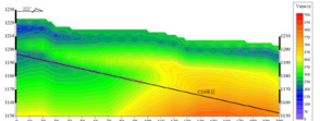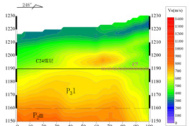 图 1 即为该煤矿 C24 煤层采空区 C7 反应特征,中部相速度为 500-700m/s 的黄色区域推断为支撑矿柱,右侧C7 区域推断为采空区,上部覆盖层疑似变形,呈现区域低速特征。