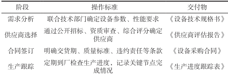 设备采购流程分为需求分析、供应商选择、合同签订、生产跟踪、到货验收五个阶段(表 1)。每个阶段设置明确的操作标准与交付物,例如需求分析阶段需提交《设备技术规格书》,供应商选择阶段需通过综合评分法(公式 1)确定中标单位。