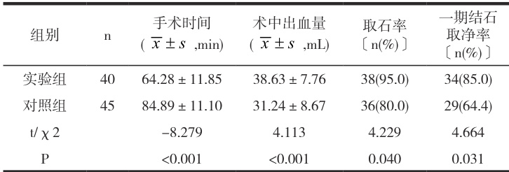 实验组手术时间少于对照组,术中出血量多于对照组,取石率和一期结石取净率均高于对照组,差异有统计学意义(P<0.05),如表1 所示。