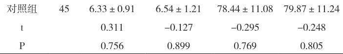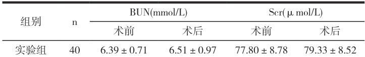 2.2 两组肾功能指标比较手术前后两组 BUN 和 Scr 均无统计学差异(P>0.05);组内比较,对照组术后 BUN 和 Scr 均高于术前,差异有统计学意义(P<0.05),如表2 所示。