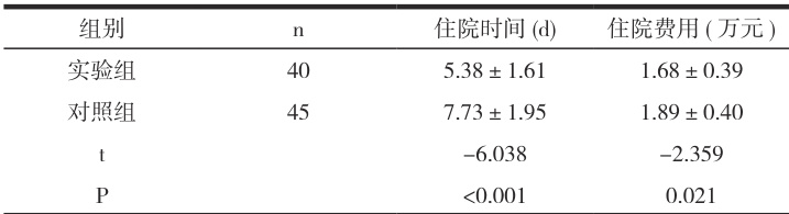 2.4 两组住院时间与住院费用比较实验组住院时间短于对照组,住院费用低于对照组,差异有统计学意义(P<0.05),如表4 所示。