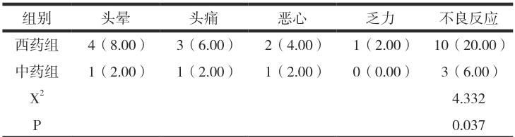 2.3 两组不良反应比较中药组更低, P<0.05 。