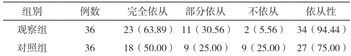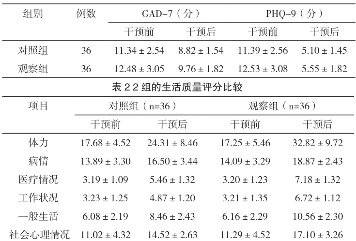 在干预后,2 组患者的 GAD-7 评分、PHQ-9 评分、CQQC 评分均有明显的改善,且在数值上,差异显著( P<0.05) 。观察组的护理依从性为 94.44% (34/36)优于对照组的 75.00% (27/36),差异明显( ΔP<0.05 )。