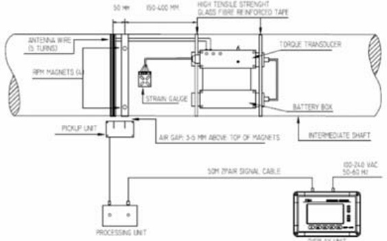 如图 1,采用非接触式遥测应变技术,在主机曲轴输出端至第一道中间轴承间的中间轴上,尽量靠近主机的位置布置全桥式应变片组,采样频率 ≥10kHz 轴功率计计测功率计算公式: