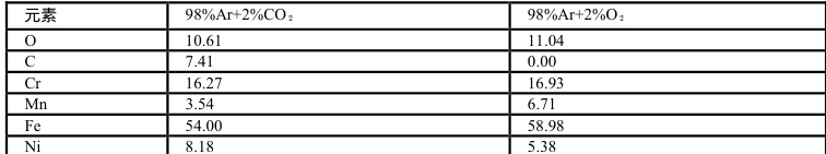 98%Ar+2%O₂保护气焊缝表面发黑严重,能谱分析(表 4)显示黑灰主要含 O( 11.04wt% )、 Mn(6.71wt% )和 Cr(16.93 wt%),为氧化锰和氧化铬,源自 O₂氧化作用。相反, 98%Ar+2%CO ₂保护气引入少量 C(7.41 wt%),但无显著氧化物,焊缝更洁净。这表明含 O₂气体加剧了合金元素氧化,导致发黑现象。