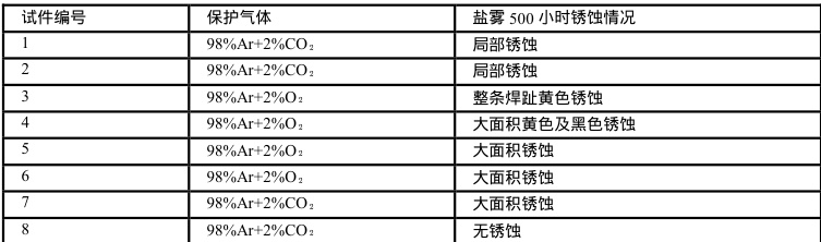 盐雾试验(500 小时)表明, 98%Ar+2%CO ₂保护气体显著提升耐腐蚀性(表 5)。角接焊缝中, 98%Ar+2%CO ₂试件(如试件 1)仅局部锈蚀,而 98%Ar+2%O; 试件(如试件 3)整条焊趾出现黄色锈蚀。对接焊缝中,98%Ar+2%CO₂+PLUSE 程序(试件 8)无锈蚀,其他组则大面积锈蚀。这归因于 CO₂减少氧化,而 O2 促进腐蚀产物形成。