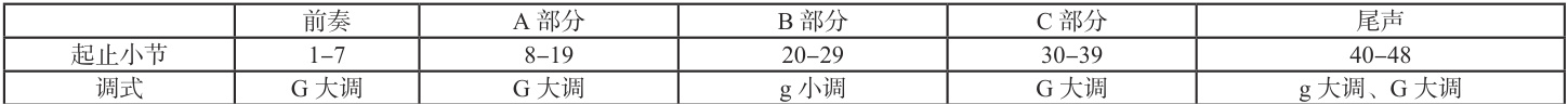 本首歌是一首由前奏和尾声的A、B、C 三部分组成的单三部曲式,其调式在G 大调和其同主音小调