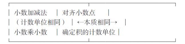 以五年级小数计算来看,从横向关联,我们还能看到小数乘法与小数加减法之间的关系,从而进一步让学生看到,小数乘小数的过程中,仅管不再能仅仅简单地看成“计数单位 × 个数”的扩展,但从横向对比中,我们依然可以清晰地看到计数单位在小数乘小数的过程中,依然是“C 位”担当。